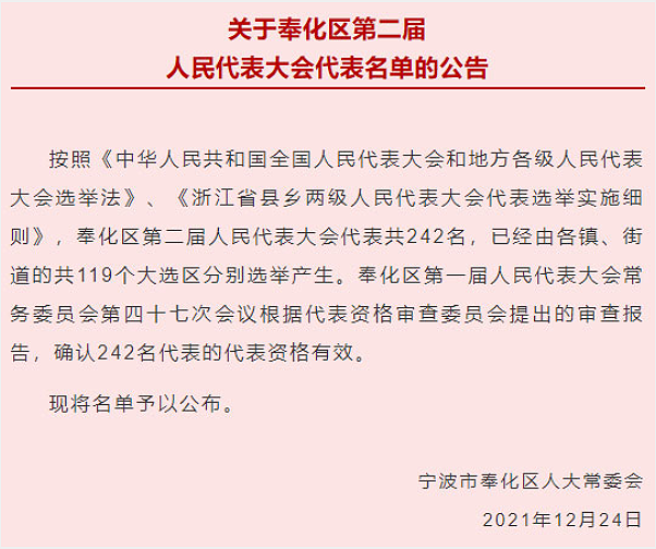 2021年12月24日,按照《中華人民共和國(guó)全國(guó)人民代表大會(huì)和地方各級(jí)人民代表大會(huì)選舉法》、《浙江省縣鄉(xiāng)兩級(jí)人民代表大會(huì)代表選舉實(shí)施細(xì)則》,奉化區(qū)第二屆人民代表大會(huì)代表選舉產(chǎn)生。