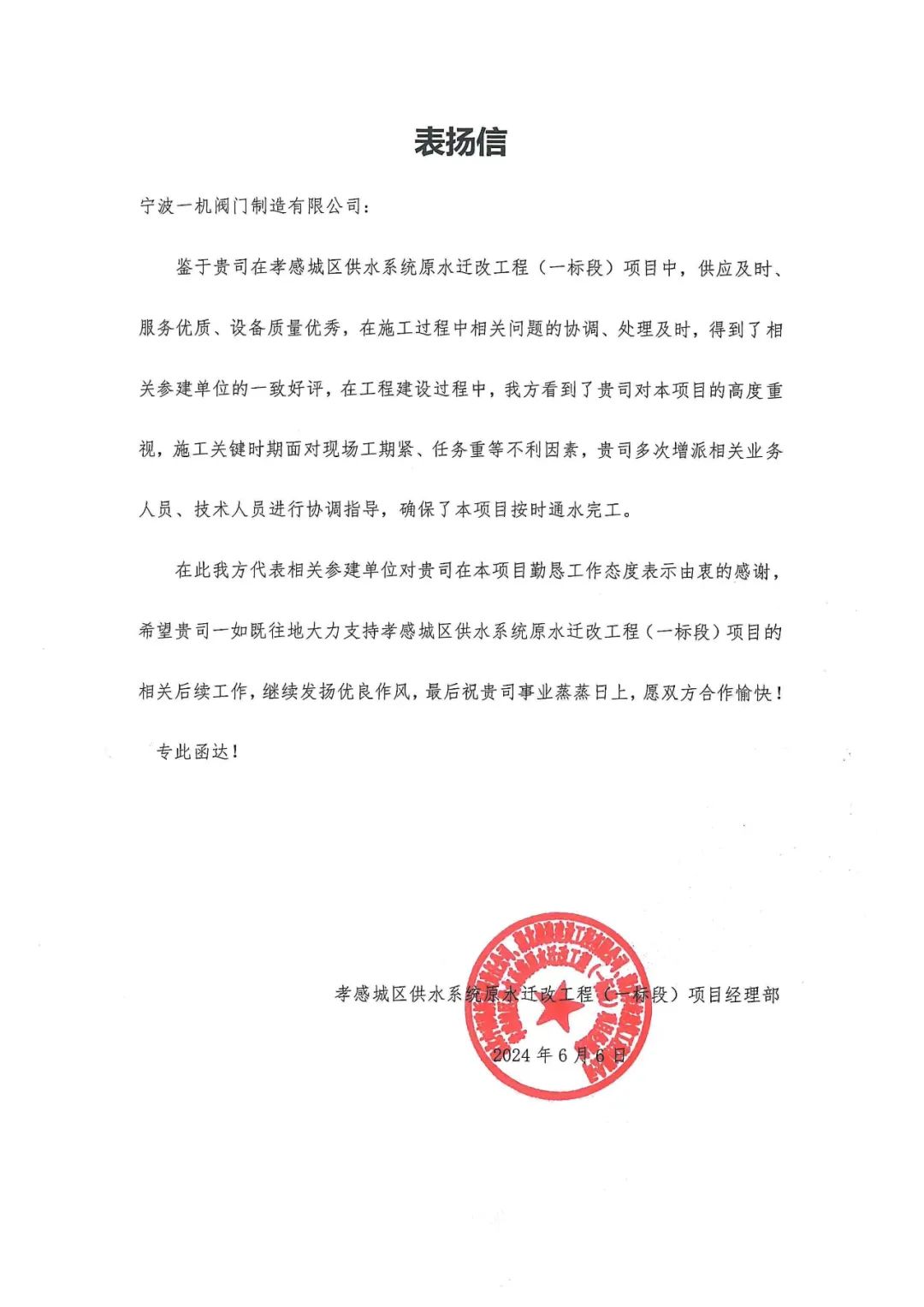 一機閥門,一直以來都是行業(yè)內(nèi)的佼佼者,其以精湛的技術(shù)、卓越的品質(zhì)和一流的服務(wù)而聞名。這份榮耀并非偶然,而是無數(shù)一機人共同努力的結(jié)果。此次湖北孝感城區(qū)供水系統(tǒng)原水遷改工程項目總投資13.17億元,是孝感有史以來單項投資最大的一項民生工程,項目包含原水取水工程、原水預(yù)處理工程、原水輸水管道工程等3個子項目。項目建成通水后,漢江供水源取水能力將由每日23萬噸增加至46萬噸,供水服務(wù)面積將超過100平方公里,惠及孝感主城區(qū)、高新區(qū)、臨空經(jīng)濟區(qū)、孝南經(jīng)濟開發(fā)區(qū)、孝南區(qū)部分鄉(xiāng)鎮(zhèn)及云夢縣城區(qū)和鄉(xiāng)鎮(zhèn)約80萬人口,有力提高孝感高質(zhì)量發(fā)展的水資源承載能力。按照市委市政府要求,工程由澴川國投集團黨委統(tǒng)一安排,在確保質(zhì)量、安全的前提下,應(yīng)快盡快,確保民生工程優(yōu)先完工,力保24年3月底前實現(xiàn)試通水,6月項目全面完工正式通水,讓市民群眾早日吃上更加優(yōu)質(zhì)的“放心水”。